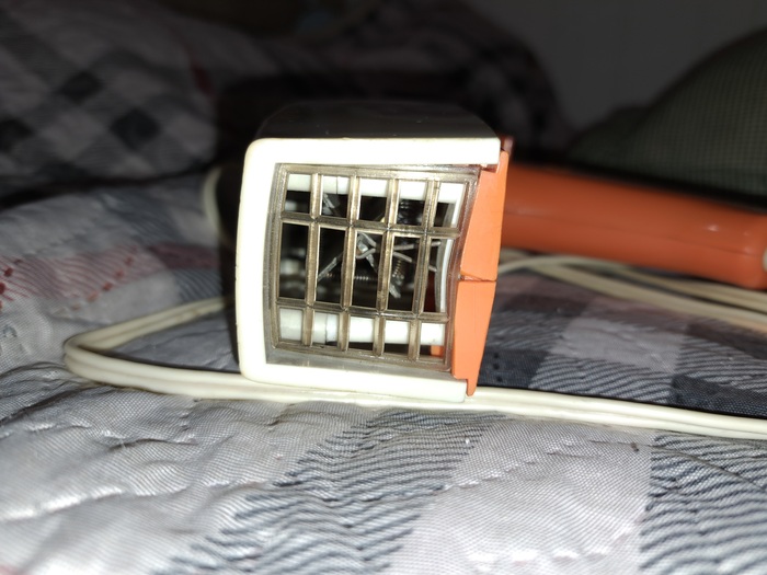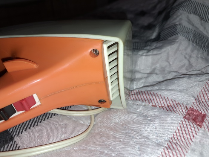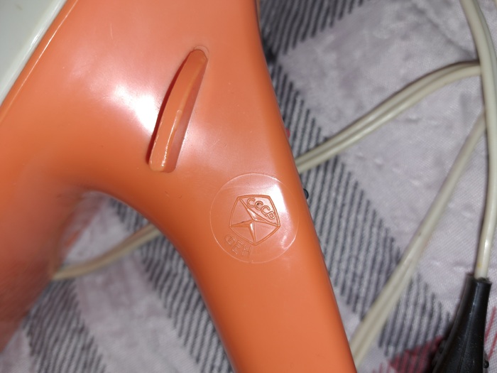 Общий вид. Провод заменён - родной был плохой и с какой-то чужеродной советской разборной вилкой примерно конца 60-х годов выпуска, этот же с неразборной советской вилкой, соответствующей периоду выпуска фена (с конца 70-х - начала 80-х)