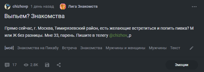 Вчера (3 мая) в знакомствах вышел пост: Выпьем? Знакомства