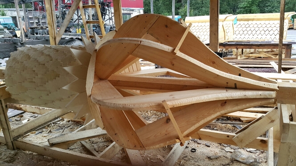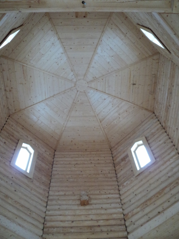 Было решено на первом этапе смонтировать сруб и тесовую часть кровли, чтобы закрыться от непогоды и можно было продолжать отделку внутри, пока не прибудет остальная часть деталей и элементов крыши и декора, наиболее трудоемкая в изготовлении. Вот сруб с частично собранной крышей: