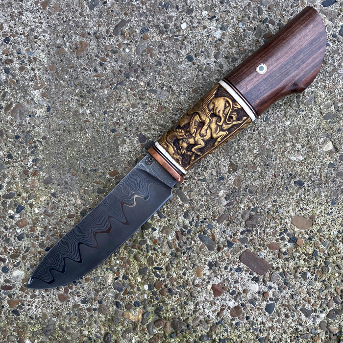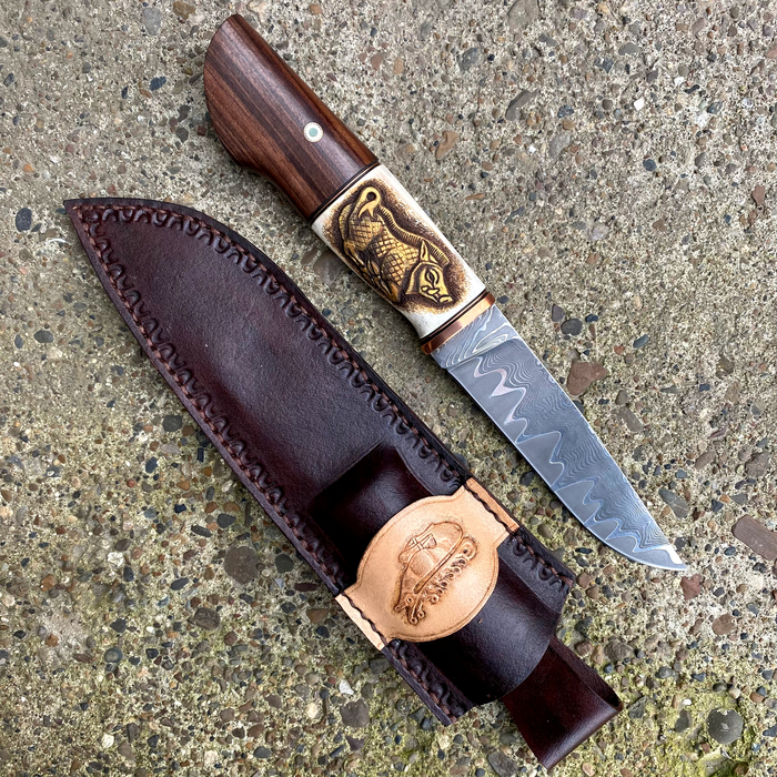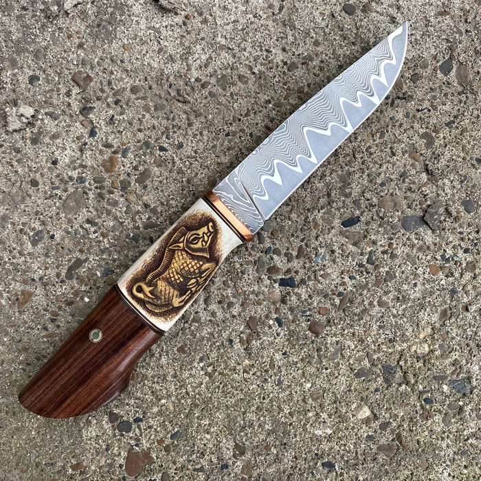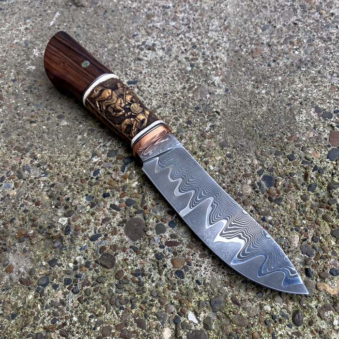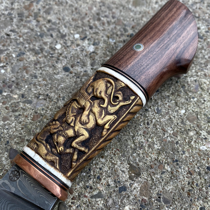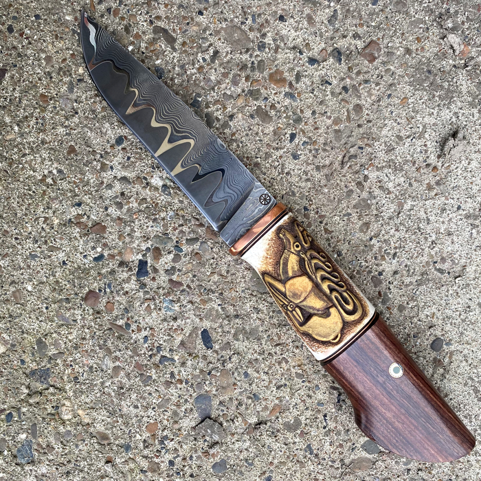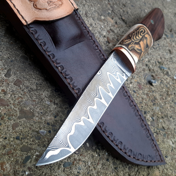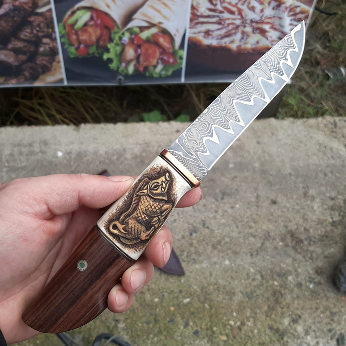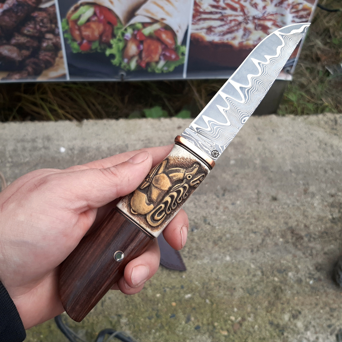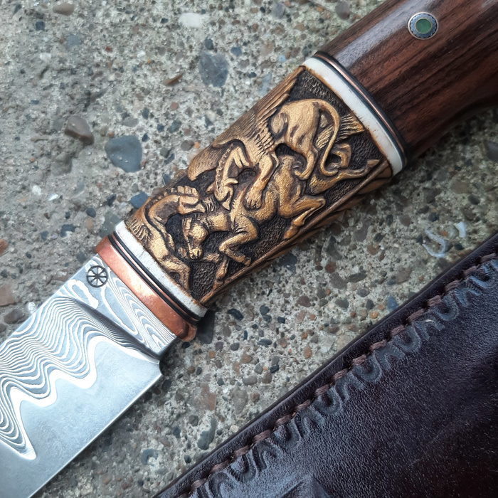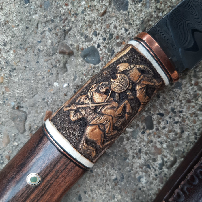 Рукоять - лосиный рог, морадо, проставки - фибра, медь, по рукояти выполнена вручную профильная резьба с добавлением объема, колорирование стойкими акриловыми красками