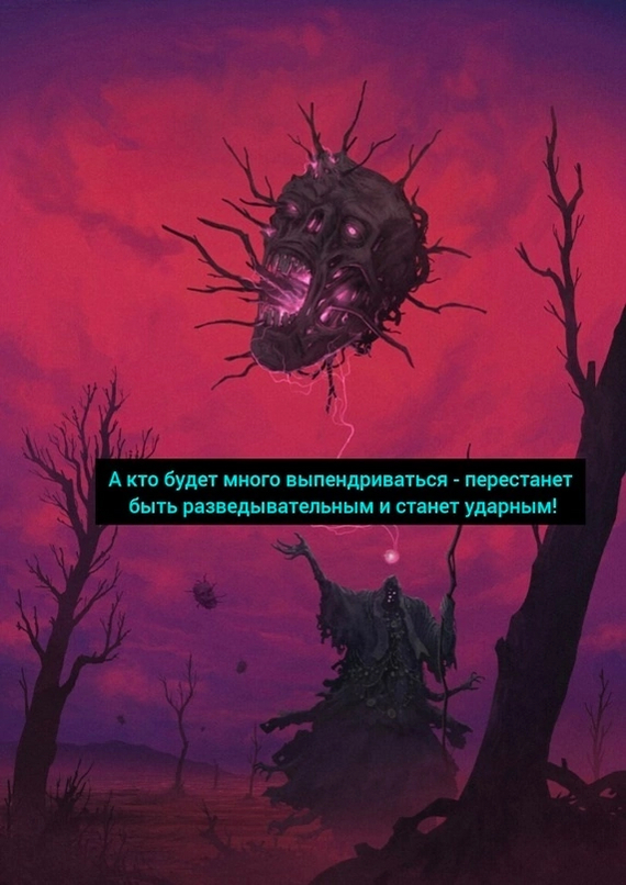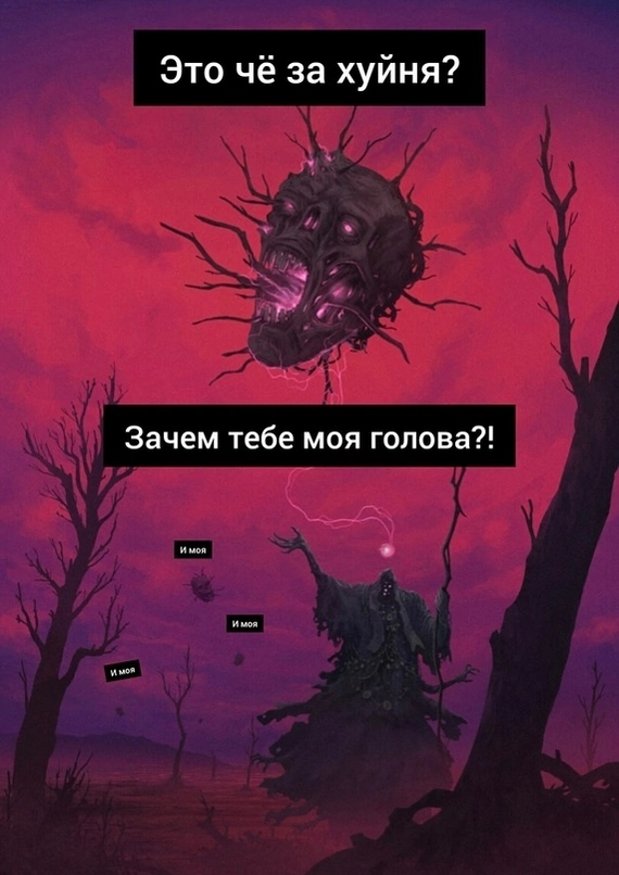 Фигура постепенно начала материализоваться в воздухе и принимать более человеческие черты и приемлемый рост. Она стояла неподвижно, как статуя, прямо напротив капитанского мостика, на носу корабля (когда туман ненадолго рассеялся, незнакомец явил им себя во всём своём величии). Глаза её неотрывно глядели на собравшихся с бурлящей в них ошеломляющей энергией, поразительно схожей с энергией Скверны и магией смерти в одном лице! Жёлто-зелёное сияние, яркое и ослепительное, словно тысяча солнц, источало неукротимую ярость. Взгляд капитана впился в два зазубренных рога, украшавших главу таинственного незнакомца, тонкого и высокого, облачённого в длинную робу фиолетового цвета с капюшоном, из-под которого развевалась по ветру лишь одна прядь седых волос.