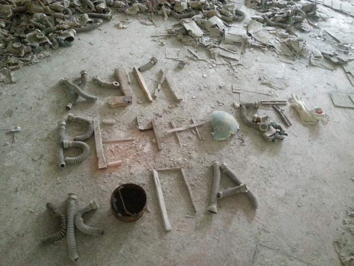 Школа №1. В помещении столовой разбросаны сотни противогазов - такое ощущение, что тут находится фабрика по производству снорков. Нам сказали, что у сталкеров-туристов есть традиция - оставлять здесь некое послание тем, кто придет позже. Вот это - творческое самовыражение именно женской части нашей группы.