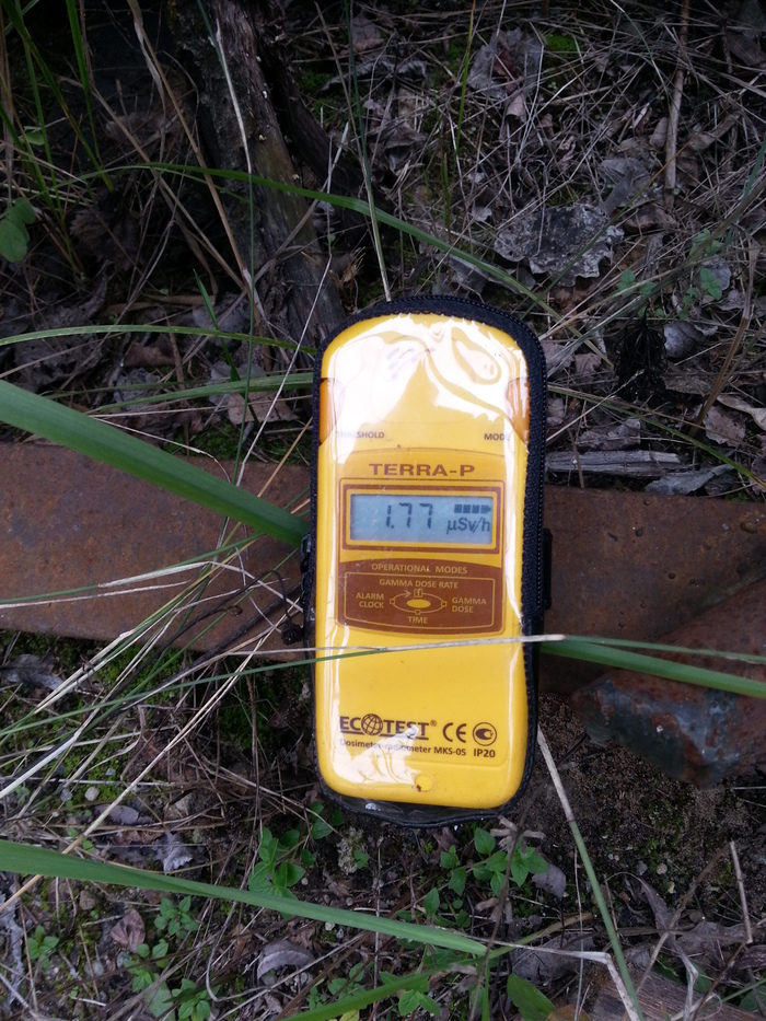 Подойти вплотную, чтобы сфоткать показания дозиметра, я очканул не успел, но если память мне не изменяет, там было что-то в районе 15-16 тысяч мкР/ч - в 300 раз выше условно безопасной нормы. В нескольких шагах фон падает до 200-300 мкР/ч, в пяти метрах можно спокойно стоять.