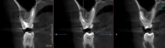 Я не стал делать 6ку сразу, т.к вообще не верил в результат (50\50 и 80\20 так себе прогнозы от докторов, я понимаю, что организм у всех разный, как и имунная система). прождав полгода, убедившись в результатах, накопив на 2 зуб, переболев гриппом иль ковидом выделил дни на лечение. Лечил в другой клинике, т.к предыдущий доктор ушёл, а эта ближе к дому. В прошлую среду лечение началось. Всё изначально пошло к херам, т.к после отхождения наркоза я почувствовал такой ад, что удаление зубов это так, цветочки, я удалял 4 зуба мудрости. Реально, внутри кисты и вокруг десны образовался маленький филиал ада, боль была чешуюся и одновременно будто нерв прищемили внутри лекарством, давление изнутри жуткое, всё начало гореть. начал изучать - пишут до 3 дней норм, ну окей, выпил кеторол, уснул т.к не спал почти сутки и в пятницу утром в 3, ровно через 1.5 часа после засыпания кеторол перестал действовать. локально воспалилась десна(без видимых признаков), жжение, боль, давление пошло на висок, в щёку и будто горячее что-то ходит по пазухе носа- к уху и так постоянно. выпил кеторол- не помог. В общем и целом до 20.10 с 17.10 я спал по 4-5 часов максимум, обычно 3 раза по 1 час- полтора, т.к просыпался от болей, не мог уснуть. в пятницу пошел к лору- думал что лекарство прорвалось в пазуху и поэтому так реакция. в эндоскоп лор не обнаружил жидкости, но обнаружил покраснений в носу, внутри пазухи. Почему я пошел к лору- гайморит пробился, правая ноздря, и нос так не дышал лет 15, я забыл что люди могут так дышать) 20.10 характер боли изменился, при давлении на зуб теперь не чувствую резкой боли, болит вокруг десны, район щеки. опухлость щеки не спадает с воскресенья, чувствуется температура вокруг зуба, при этом в воскресенье было 37, пнд и дальше уже нормальная. вчера не выдержал, пошел к зубному- принял другой врач, посмотрел без вскрытия, сообщил что у щеки очаг, мешочек, его либо вскрывать, либо ждать пока уйдет, гной типа не полностью образовался, надо резать десну возможно, зависит от опухлости и размера щеки в дальнейшем. т.е лекарство работает, боль изменилась, плановое вскрытие, чистка, замена кальцида на четверг назначена. сейчас вот поспал 5 часов, опять не могу, кеторол пью 6 день в перемешку с немисилом. Вчера назначили антибиотики, впыил вчера утром,боль проходит после болеутоляющего, но ноет потом весь день щека, пазуха, десна вокруг зуба и так уже 6 день. На снимке ниже кт месячной давности перед лечением, киста больше 6 мм, она в принципе очень выросла за полгода на милиметр-два точно