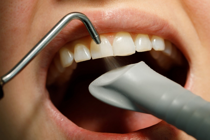 2 Далее мы приступаем к удалению пигментированного налета водно-воздушно-абразивным методом «Air-Flow», когда под давлением подается смесь содового порошка, воздуха и воды на поверхность зуба, которая сбивает смолянистый налет. Эмаль при этом также не повреждается, так как мощности струи не хватит для того, чтобы повредить самую прочную ткань организма.