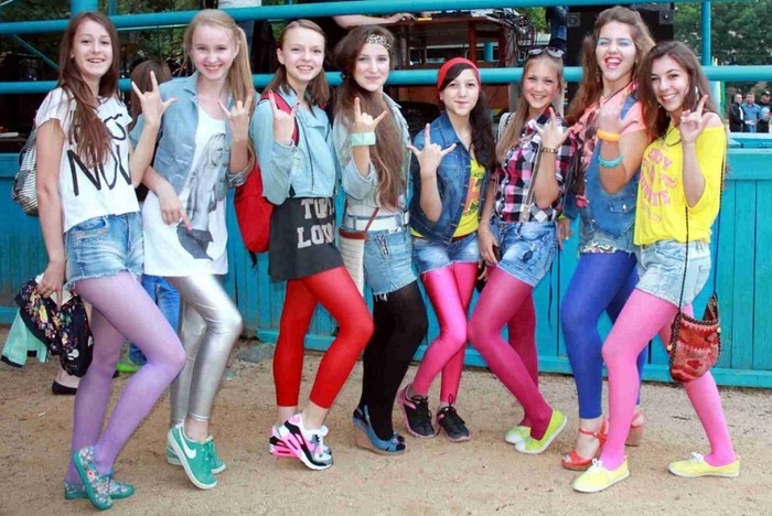 В России же наступило время «лихих 90-х», когда здесь просто копировали все, что шло с Запада. Это время запомнилось обтягивающими брюками и лосинами, а также «кислотными» цветами, в которые мог быть окрашен любой элемент одежды.