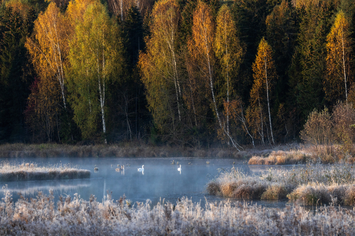 Здесь остальные. Потрясающие картины предстали моему взору! Контрасты осени завораживали: листва деревьев словно пылала на солнце, а вся трава была покрыта сверкающим инеем. Над речкой красиво стелился легкий туман.
