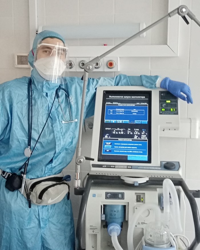 Мужчина, 60+, из довольно далёкого города. Неделя лихорадки с кашлем, родня (все медики) кормила его антибиотиками с жаропонижающими, а потом он по работе приехал в Москву и на следующий день попал к нам. КТ-4. Первый день вроде ничего, пошёл на неинвазивке, но потом заметался и был переведён на ИВЛ. Сейчас даже ничего, все параметры улучшились, только давление приходится сбивать постоянной инфузией гипотензивных.