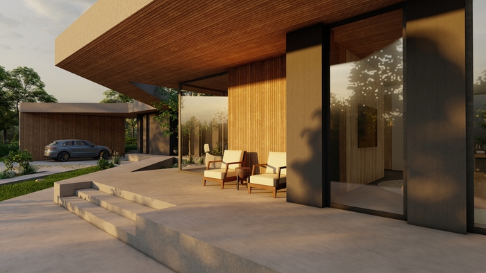 Участки чередуются с крупными застекленными проемами(световые колодцы), которые могут выглядеть как озера - поверхность воды напоминает стекло