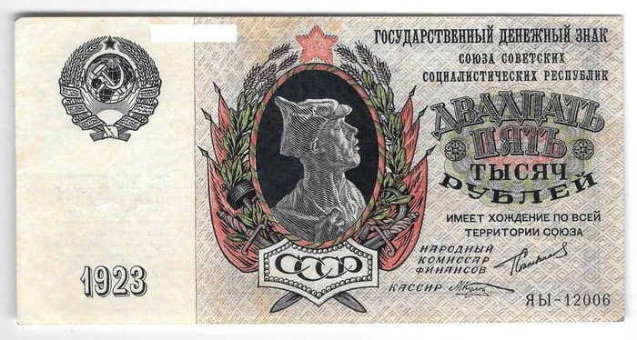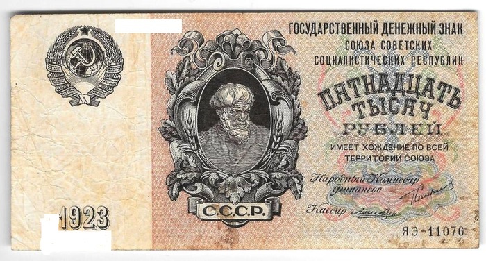 Автор сюжетов двух номиналов первых дензнаков СССР – 15000 руб и 25000 руб – скульптор И.Д. Шадр.