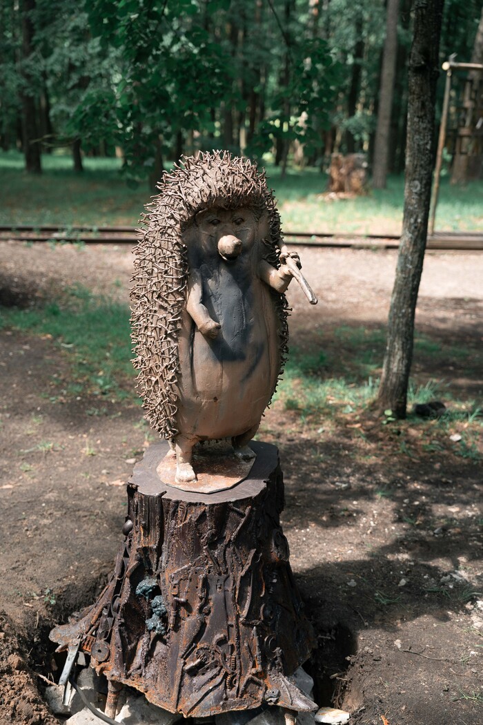 И вот буквально несколько часов назад дядя Вова водрузил нашего мультгероя на новый постамент и она стала частью его большого парка скульптур. Под этого красавца игольчатого сделан отдельный постамент, на котором он теперь стоит и смотрит на гостей парка Степанова.