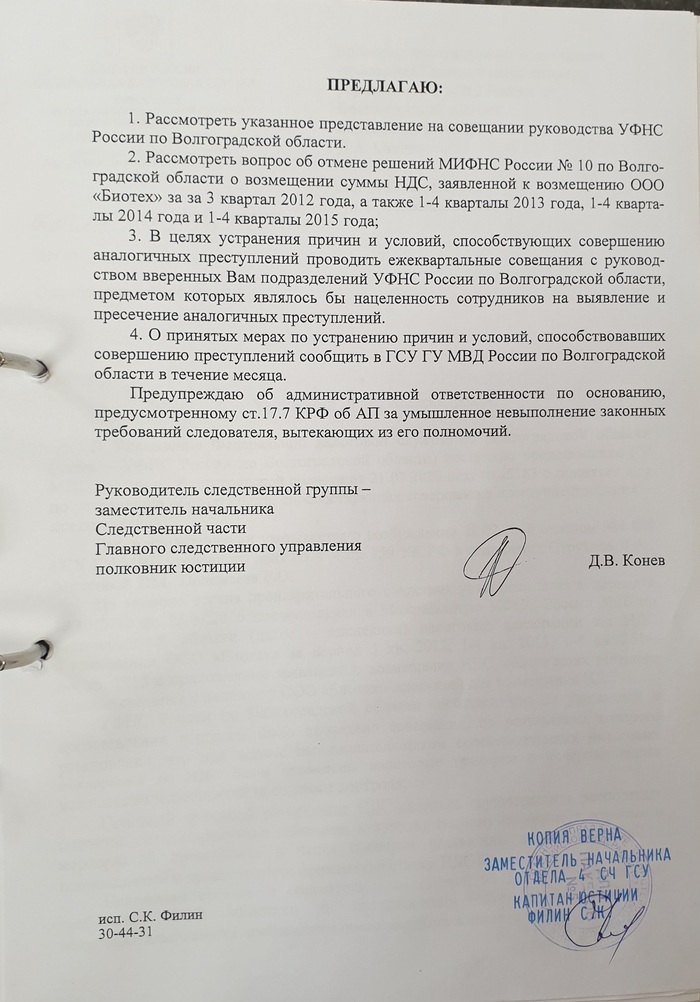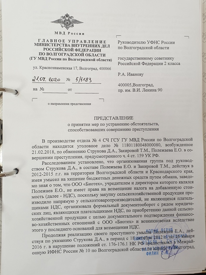 Более того, в ответ на представление ВРИО начальника ГСУ ГУ МВД РФ по Волгоградской области Савина Д.А.