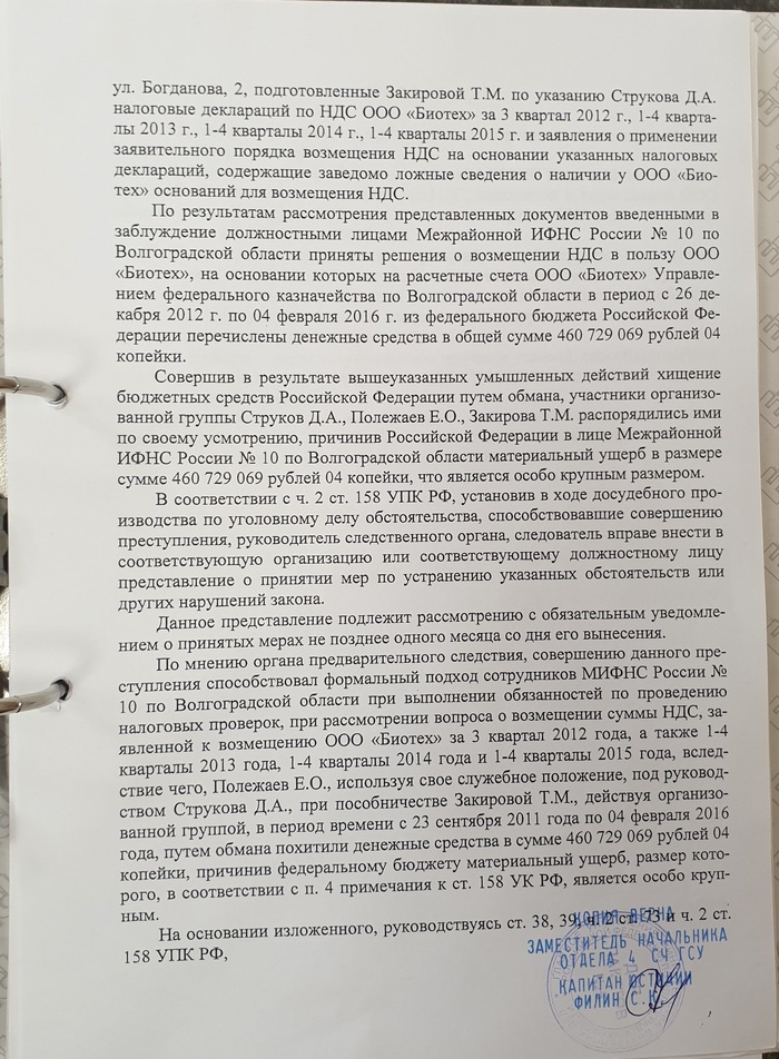 Закировой Т.М. и лица, по мнению следствия, контролирующего данную организацию - Струкова Д.А. Фабула- незаконное возмещение НДС в период 2012-2015 гг. путем обмана налогового органа, создание формального документооборота, предоставление недостоверной отчетности. Следствие длилось более 30 месяцев. В данный момент уголовное дело находится на рассмотрении Советского районного суда г. Волгограда на стадии изучении доказательств обвинения.