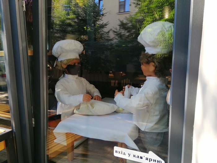Витрины тут — отдельный вид искусства. Поварята в масках месят тесто, фигурки движущиеся. Мы потом встретим еще заведения этой сети. Сюжет — сидит мышка, повар спит. У мыши в руках украденный крендель. Повар - лежащая на спине пузатая фигурка-манекен. ДЫШИТ! Круглое пузо вздымается вверх-вниз, не приглядываясь и не заметишь. Внимание и любовь к деталям — этого у местных не отнять.