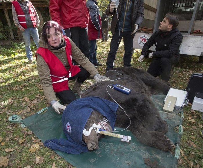 Потребовалось 8 человек, чтобы перенести косолапого.
