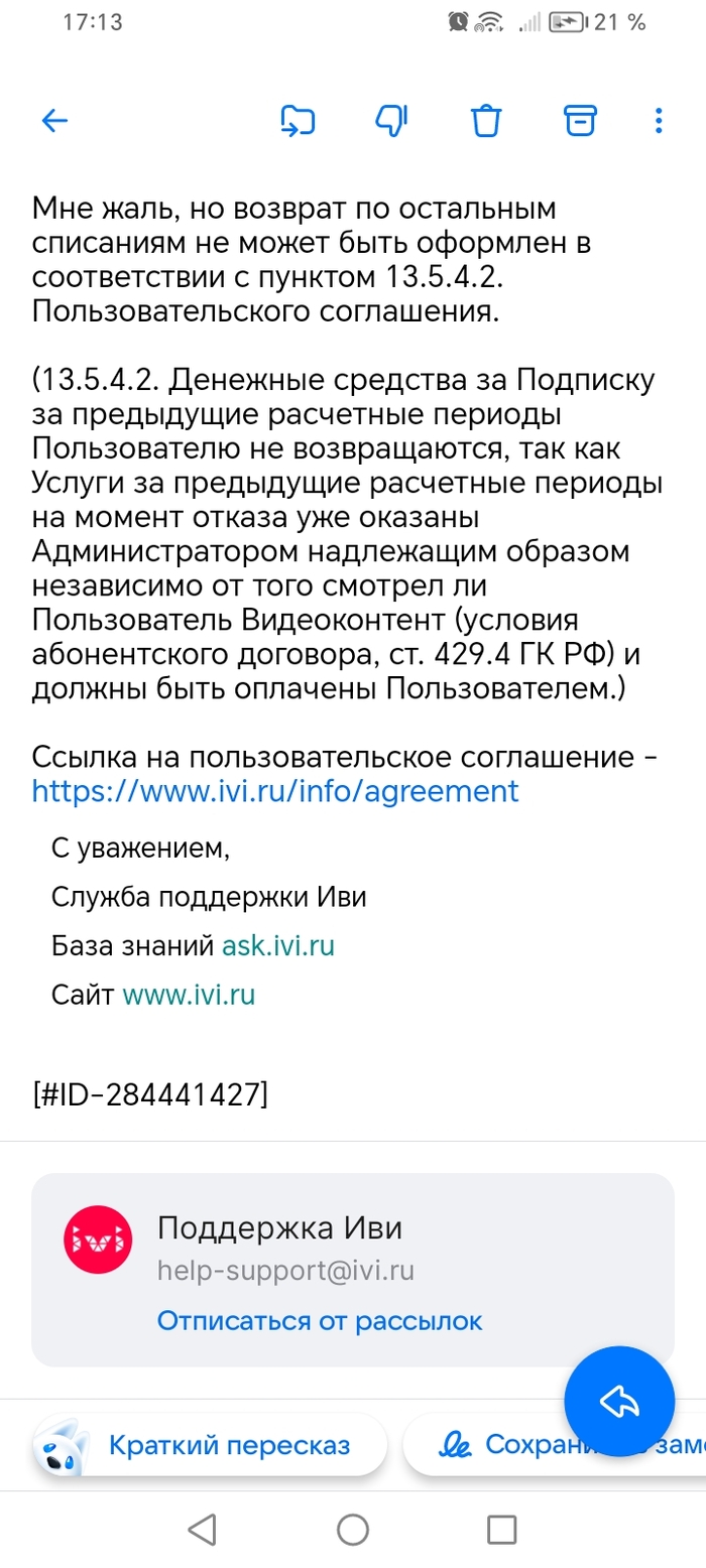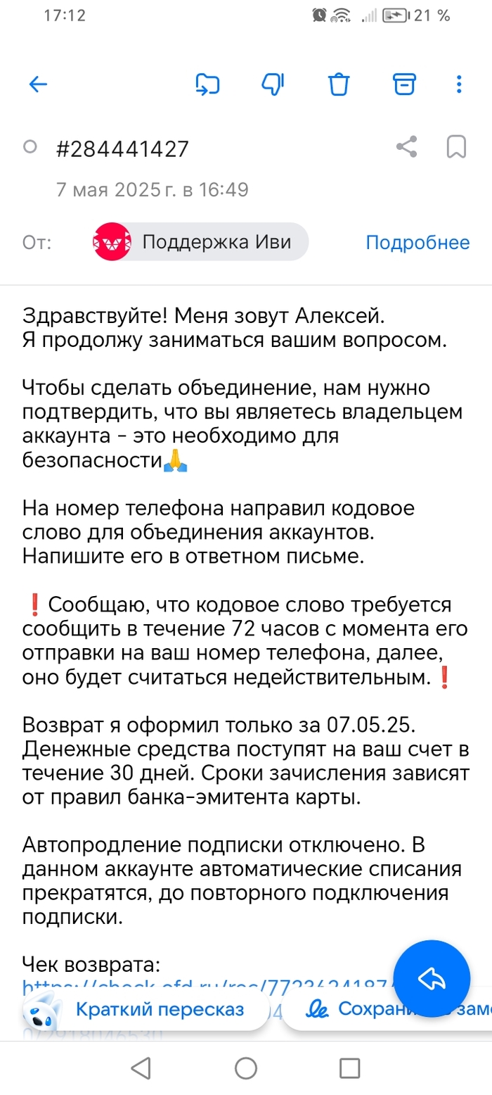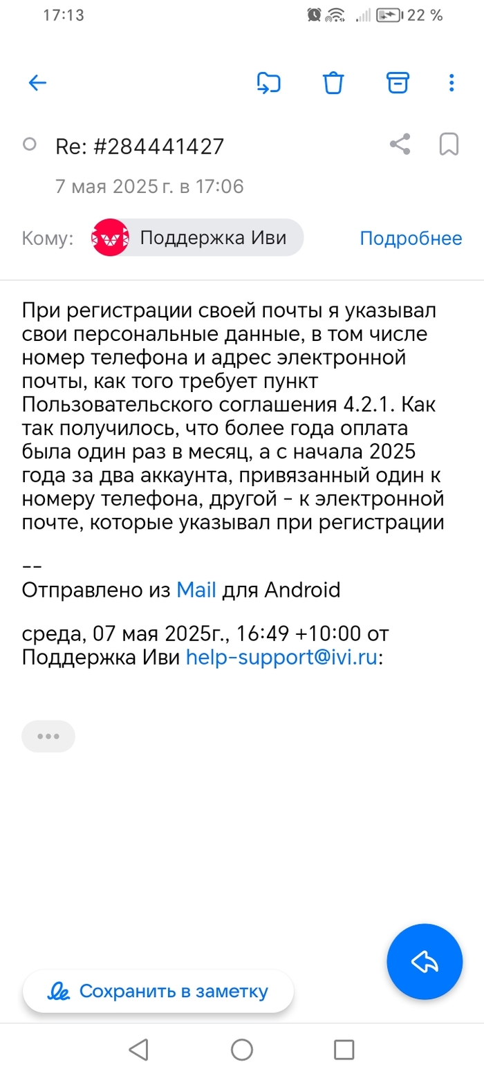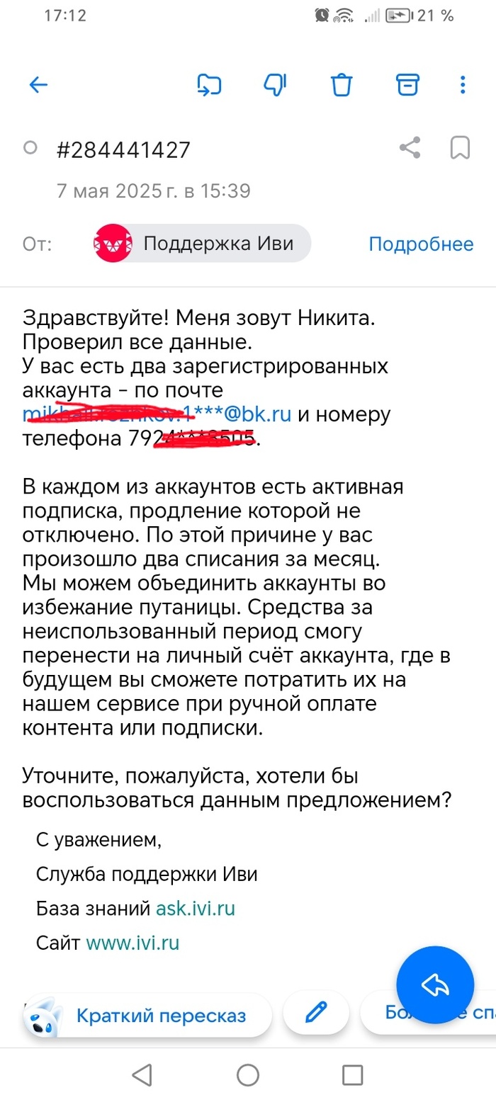 Пишу кратко и по сути. Примерно два года пользуюсь подпиской "IVI" за скромные 399 рублей в месяц, так как смотрю не часто, но иногда хочется быстро посмотреть какой-нибудь фильм. 07 мая 2025 года обратил внимание, что в течение месяца повторно пришло уведомление о автоматическом списании оплаты за указанную выше подписку. Посмотрев историю списания денежных средств, обнаружил, что списания происходили дважды в месяц начиная с января 2025 года каждый раз на 399 рублей. Написав о данной ситуации в поддержку, как ни странно ответили быстро. Объяснили, что у меня два аккаунта уже: один по номеру телефона, другой по электронной почте.