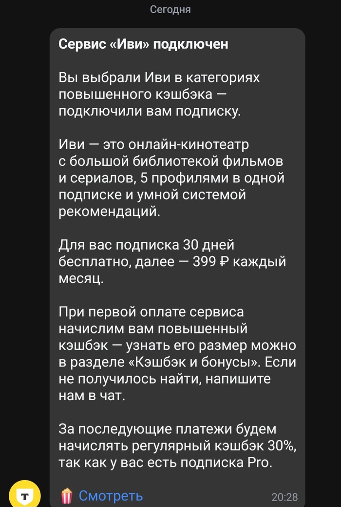 А теперь внимание: ваше отключение нихуя не стоит для них. Просто берут и списывают. Далее чат-бот: ой, а вы не пользуетесь?! А вот сняли, думали вы передумали. Ну тогда можете вывести деньги, но только на счет аккаунта, но не далее и можете потом купить у нас на эти деньги посмотреть кино или подписку.