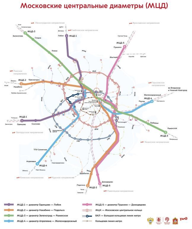 Проект Московских центральных диаметров подразумевает запуск пяти линий: первые два диаметра — МЦД-1 от Одинцова до Лобни и МЦД-2 от Нахабина до Подольска. Затем планируется запустить МЦД-3 от Зеленограда до Раменского, МЦД-4 — от Апрелевки до Железнодорожного и МЦД-5 от Пушкино до Домодедово. В ходе проектирования маршруты трех последних диаметров могут быть изменены. По подсчету экспертов реализация проекта МЦД разгрузит всю транспортную инфраструктуру столицы на 10−12%. Ранее сообщалось, что движение по первым двум МЦД от Одинцова до Лобни и от Нахабина до Подольска будет запущено в ноябре. На момент запуска интервал движения поездов составит пять-шесть минут в час пик.