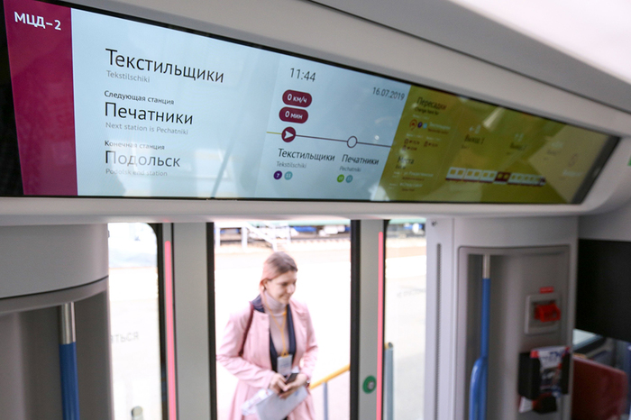 В поездах установили информационные экраны, аналогичные тем, что работают в поездах метро. На них будут транслироваться важные сведения об изменениях в работе транспорта, справочная информация о МЦД и других видах транспорта.