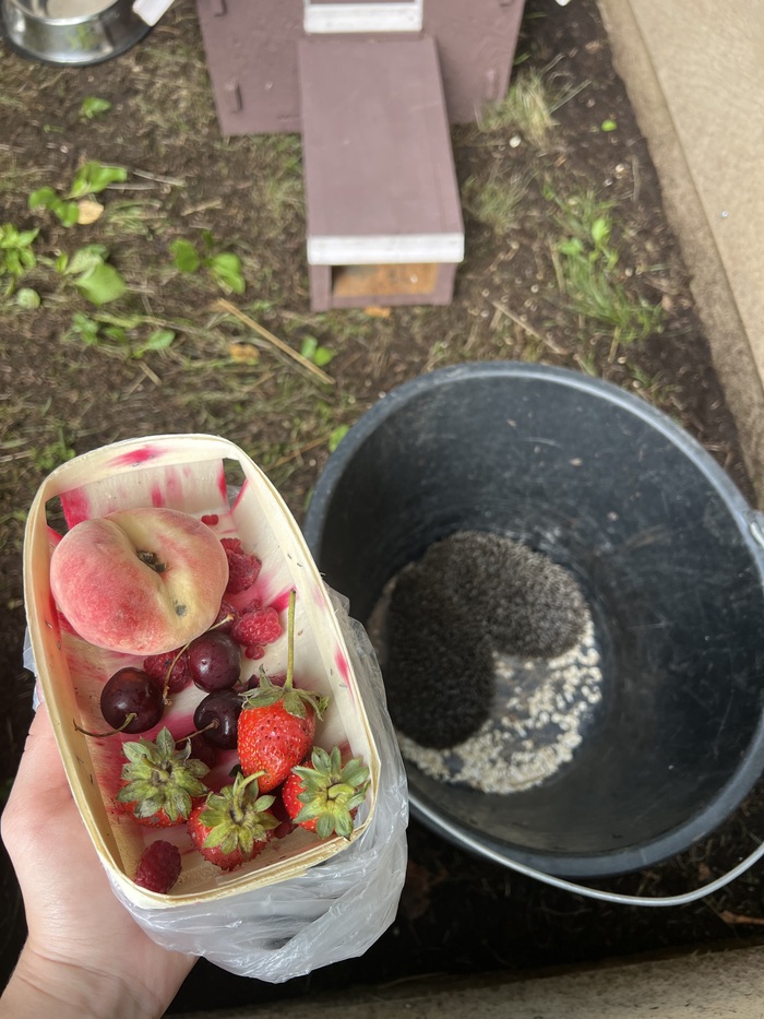 После уборки или взвешиваний всегда даю ежикам что-нибудь вкусненькое. Чтоб не обижались. С удовольствием едят персики и абрикосы, черешню, дыню. Клубнику, малину и вишню по остаточному принципу, но после ночи миски всегда пустые в любом случае.