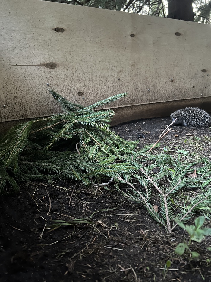 Ежата выросли до габаритов взрослых ежей, стали деловыми и серьезными. Много гуляют, для развлечений продолжаем запускать им в загон лягушек. Положили веток и лапник, ежи смастерили из него подобие шалаша. Но спят исключительно в домике. Может, у вас есть идеи что еще поместить в газон ежикам чтоб скрасить их жизнь до зимовки?