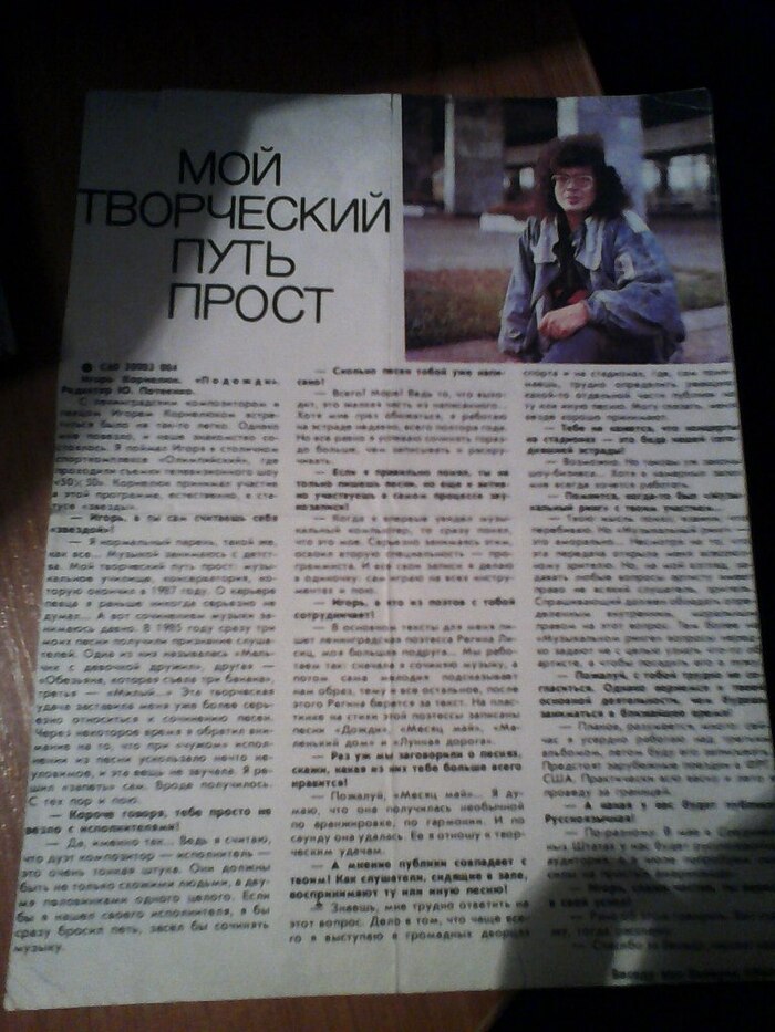 Еще до популярности Игорь Евгеньевич старался найти возможность, чтобы предложить свою музыку известным на тот момент исполнителям. Так случилось и с Валерием Леонтьевым. Певец похвалил молодого коллегу, но сказал, что его репертуара хватит на годы вперед. Корнелюк расстроился и на эмоциях подумал: «Вы у меня еще попросите песен!». Его наивное предсказание сбылось: спустя семь лет Леонтьев попросил его написать пару композиций.