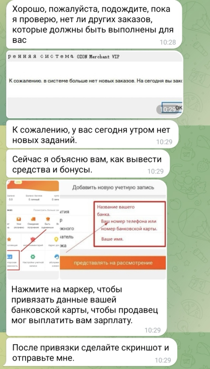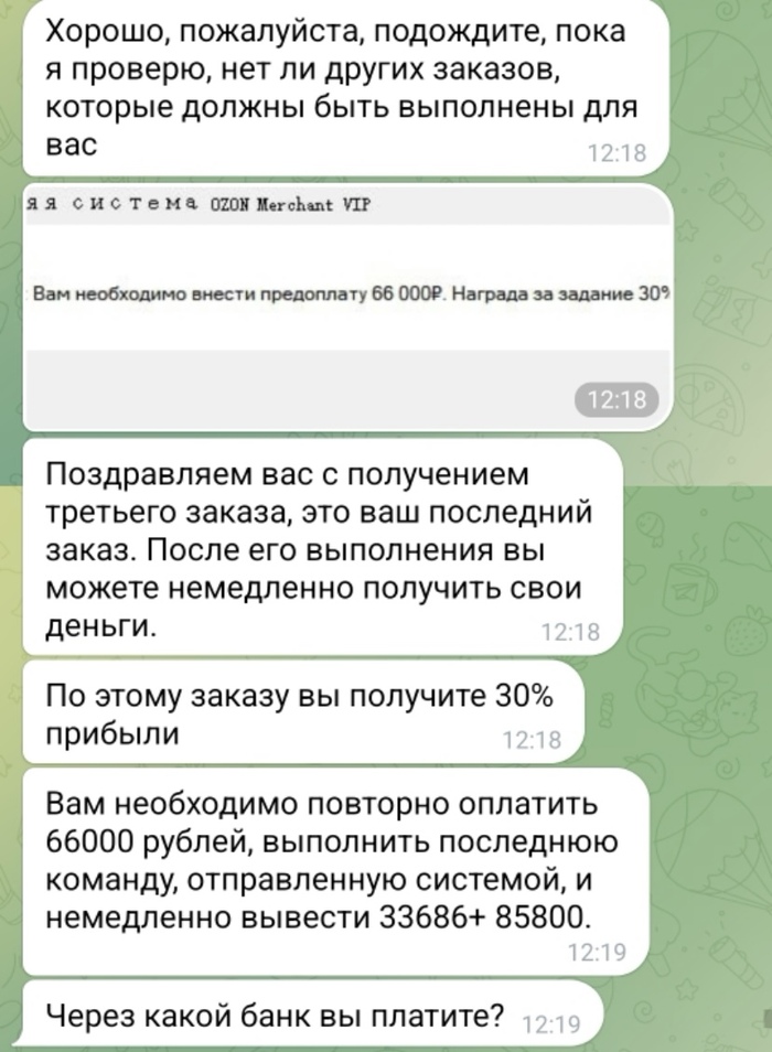 Пишут или записывают голосовое сообщение в телеграм, предлагают работу на озон. Ставить лайк, выкупать товар и получать деньги. Переводят в первый день 300 руб. На следующий день разводят на деньги.