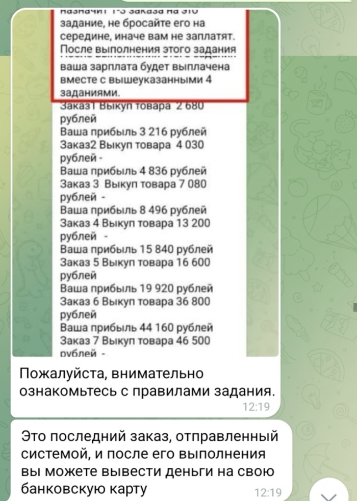 Приходят небольшие задания, вы их выполняете и вам переводят деньги 300-500 рублей. Затем добавляют в общий чат, сообщения всегда одинаковые как под копирку, даже смешно. Так они мотивируют, чтоб вы перевели деньги и уже наконец начали зарабатывать свои миллионы. В таком рабочем чате может и будет еще пару таких же счастливчиков как и вы, и то не факт, ну а остальные ненастоящие. После задания уже приходят более крупные выкупить товар/внести предоплату. Сначала это 3-5 тысяч, далее по 20, а после 60-80 тысяч рублей и тд. Выплаты изначально копеечные, чтобы выработалось доверие, а далее выкачивают деньги. Вывести деньги невозможно, пока все не вытянут из вас.