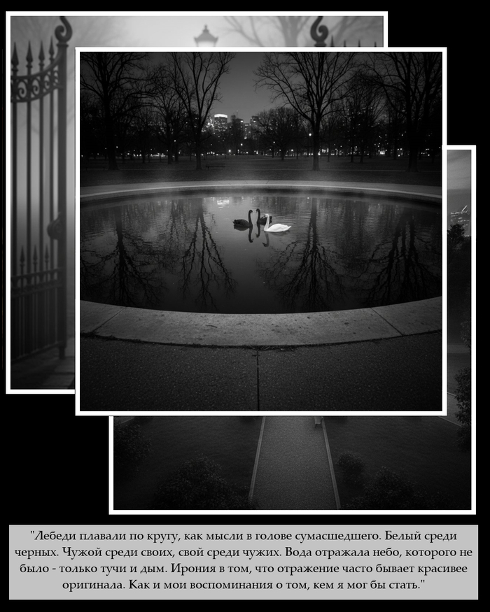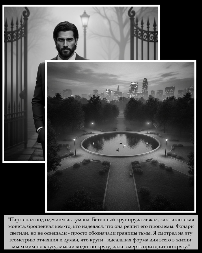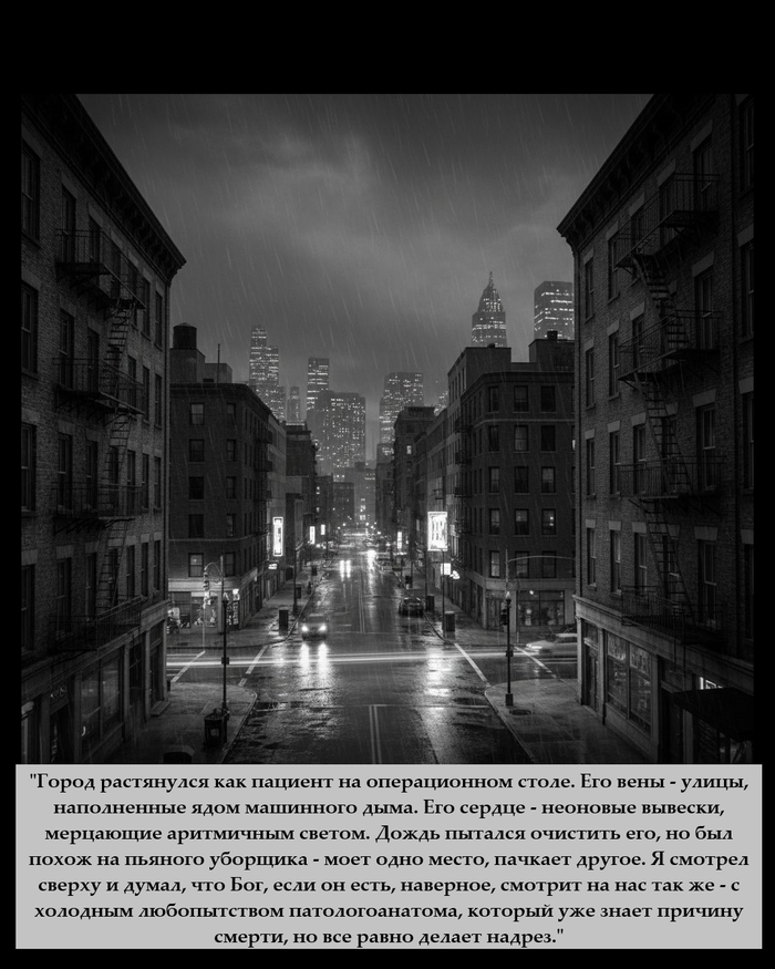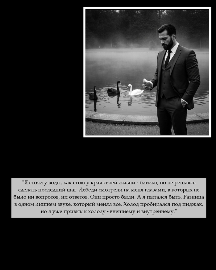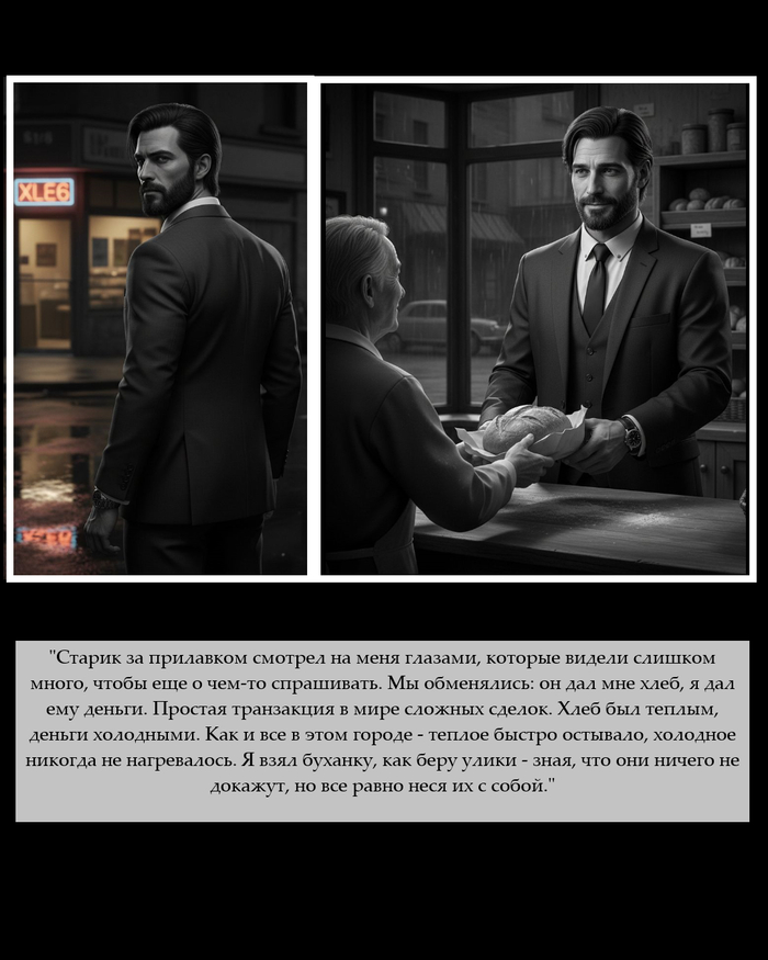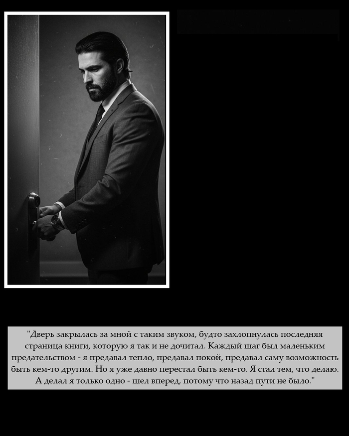 “Говорят, средний класс — это опора общества. Но любой опоре свойственно трескаться под весом обязательств. Ты надеваешь костюм, как броню, зарабатываешь свой хлеб, но в конце дня ты просто курьер, доставляющий ресурсы тем, чей аппетит невозможно удовлетворить…”