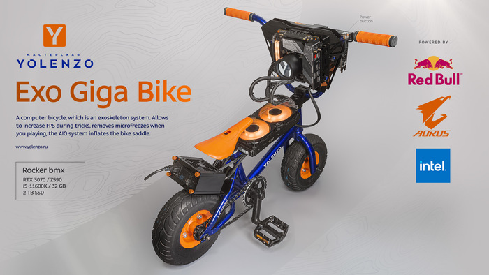 Экзо Гига Байк — первый в мире компьютер-велосипед. Проект, выполненный по заказу компаний Gigabyte (Aorus), Red Bull и при поддержки Intel. Инженерам мастерской Yolenzo удалось сделать невозможное возможным: игровой велосипед mini BMX, на котором можно играть и полноценно ездить по городу, делать простые трюки. Компоновка деталей позволят комфортно крутить педали, сидеть, поворачивать руль на 90 градусов. Проект дополняет мощная начинка в виде RTX 3070 и 11600K, с элегантно расположенной системой водяного охлаждения которые могут стать достойным подарком для продвинутого геймера.