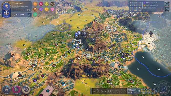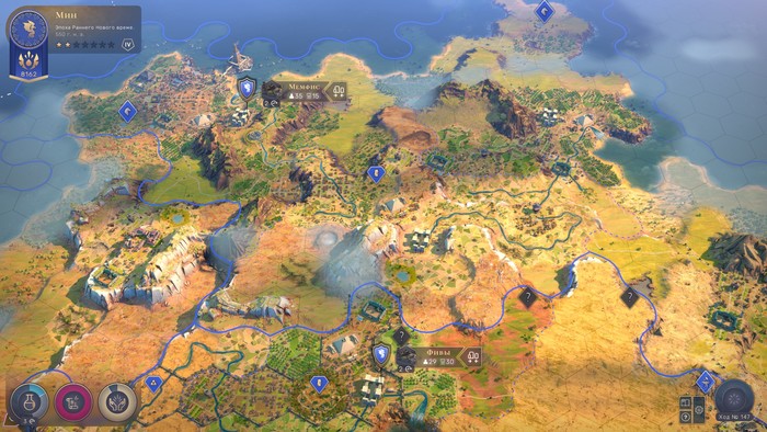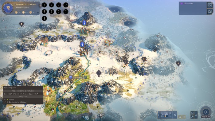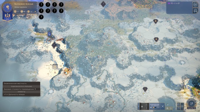 Самое главное, именно в неолите игрок проводит разведку местности, получая представления об окружающем мире. В отличие от Цивы наш первый город не возникает в тумане терры-инкогнито. Ещё до основания первых поселений мы можем (и должны!) выяснить: где протекают основные реки, где возвышаются горные хребты, даже где шастают наши будущие соседи. Видны даже стратегические ресурсы и ресурсы роскоши. Правда, большинство из них скрыты знаками вопроса. Мы ещё не знаем, что именно находится в этой местности и даже к какой эпохе ресурс относится, но заранее понимаем — там что-то есть (серебро, уран, нефть, чай и т. д.)