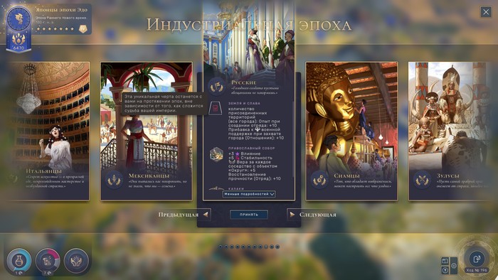 Теоретически Humankind позволяет игроку сохранить прежнюю культуру в момент смены эпохи. Любителям держаться за национальные корни игра даже выдаёт дополнительные очки победы. Однако… в моём понимании реального выбора здесь не стоит. Если игрок не хочет менять культуру: он либо дурак, либо хардкорный геймер, возжелавший устроить себе испытание.