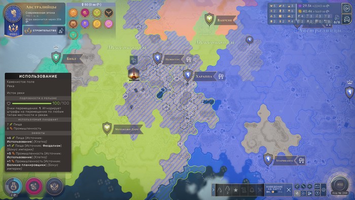 Пища, очки производства и науки концентрируются в городе. Чем больше к нему присоединено аванпостов, тем больше бонусов от земли он получает. В будущем даже появится возможность объединять города, суммируя их бонусы, но это потребует колоссального влияния (очков культуры), которое является, едва ли, не главным ресурсом в игре. Именно за влияние мы: возводим новые аванпосты, принимаем социальные политики, выкупаем чудеса света и т.д.