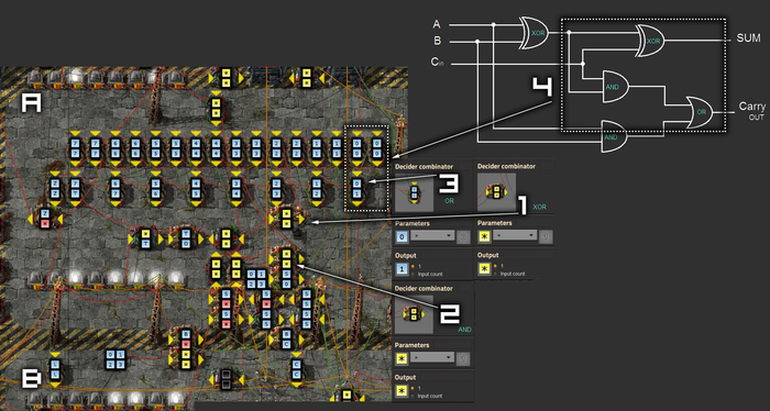 Я объясню только, как создать подобный сумматор в Factorio.