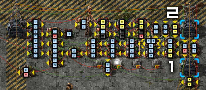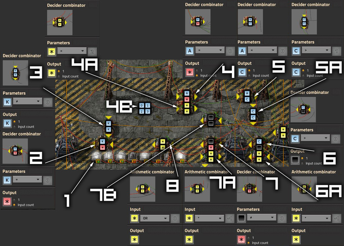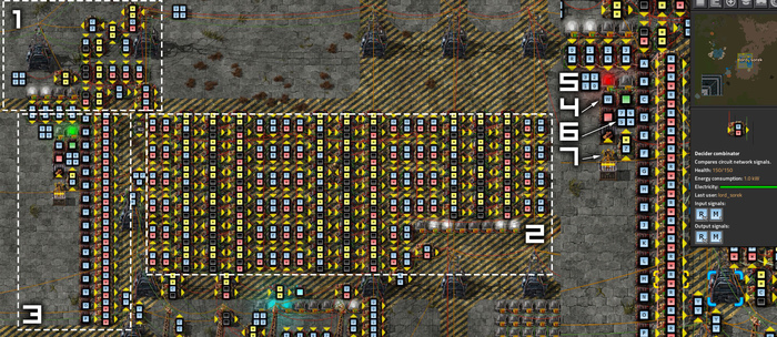 LCD включается 9 шагами для чисел (3). Нам нужно просто задать те фонари, соответствующие шагам (1), а затем использовать затворы (2) для вывода значения именно туда, куда нам требуется. Просто нужно не забывать добавлять отдельный комбинатор констант (3) и подключать его только к одному специальному затвору (2). Затем мы просто подключаем друг к другу все фонари и даём им инструкции, на каком шаге они находятся (1).