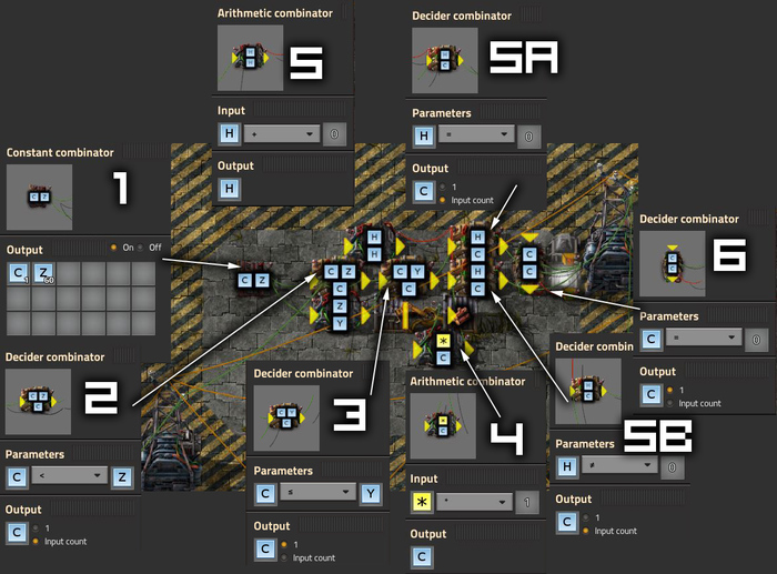(1) Это базовый комбинатор констант, подающий сигналы на генератор. Он переходит к (2), где объединены вместе ввод и вывод. Благодаря этой конфигурации с каждым тактом игры (UPS) значение [C] увеличивается на 1. Когда оно достигает [Z], то сбрасывается до 0. То есть Z сообщает нам, сколько игровых тактов необходимо для сброса генератора. Ниже также есть простой делитель на 2, благодаря которому генератор половину времени находится в состоянии высокого сигнала, а половину — в состоянии низкого сигнала. Когда C меньше значения [Y] (которое равно половине [Z]), генератор находится в высоком состоянии, в противном случае — в низком.