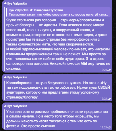 Ну, снова давайте вернёмся к тому, что канал накрученный и никакого «взаимного»™ продвижения там быть не может. Любой киберспортсмен/блогер/контент-мейкер/стример с IQ чуть выше единицы поймёт, что дело максимально мутное.