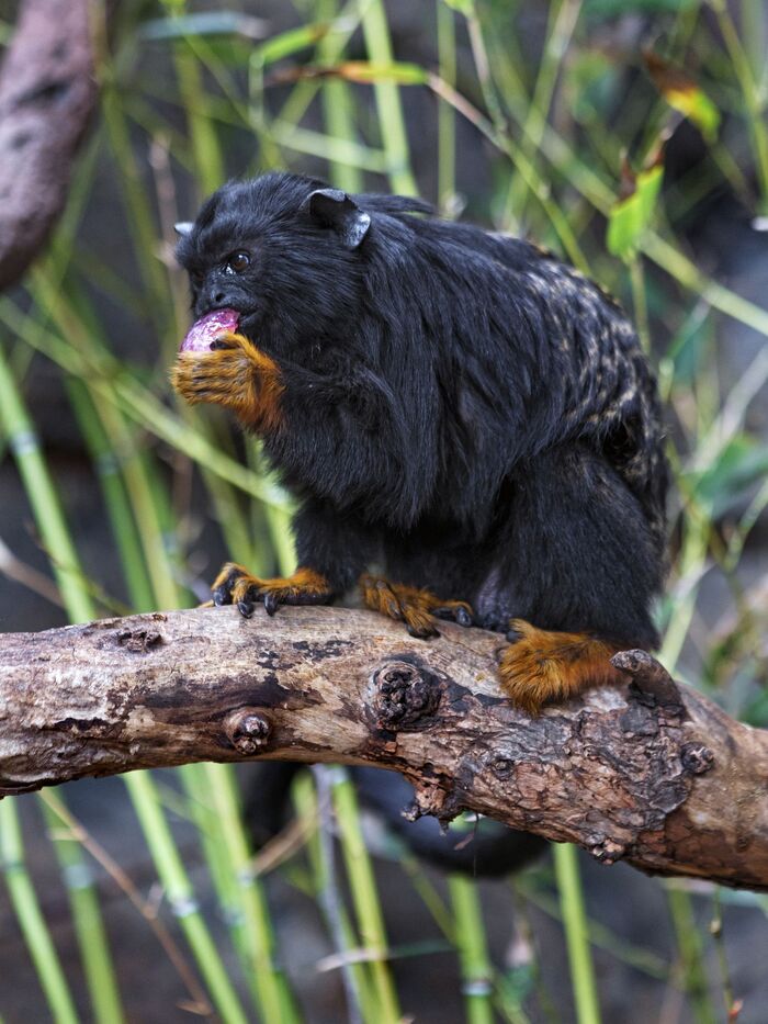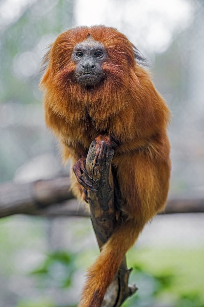Золотистая львиная игрунка – небольшая обезьянка, достигает 900 грамм веса, это самый крупный представитель игрунок – длина тела около 20-25 см. Насыщенный ярко-рыжий цвет в шерсти обусловлен высоким содержанием каротина в пище. Живут группами, похожими на прайды львов, активны на протяжении от рассвета до заката. Создают себе место для ночлега перед сумерками и каждый день это место меняют. Обитают в Бразилии, Южная Америка, язык – португальский.
