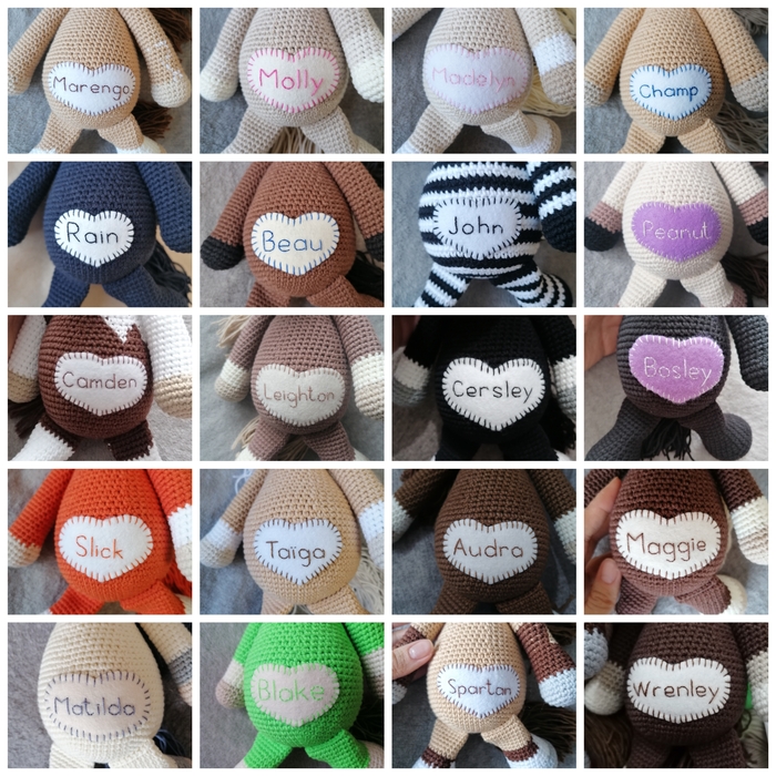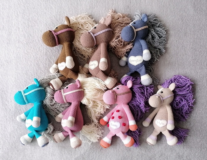 Все лошадки связаны из полухлопка ЯрнАрт Джинс, крючок 2,5. Размер 27-28см от ушей до копыт.