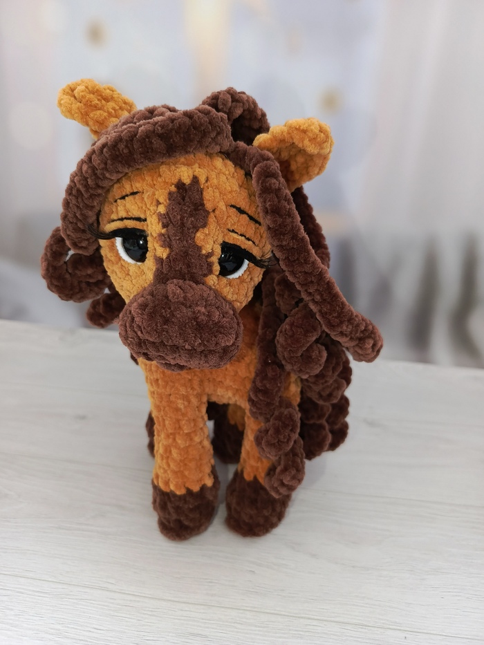 Выполнена под заказ. Проведена роспись корпуса с наклейками, грива с хвостом из натуральной окрашенной козьей шерсти, добавлены реснички. Последнее фото - до преображения.