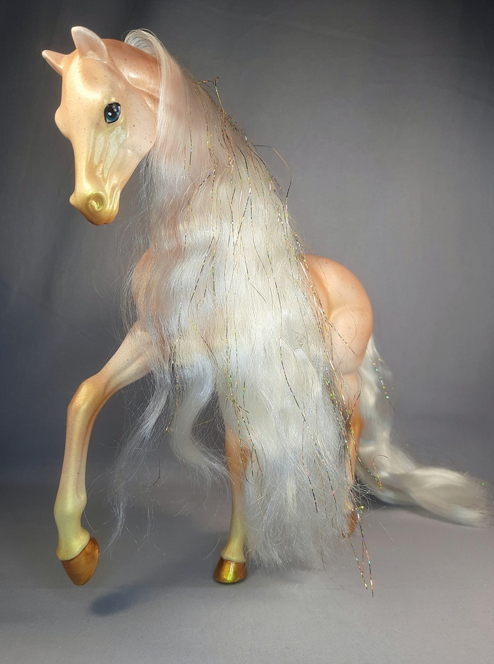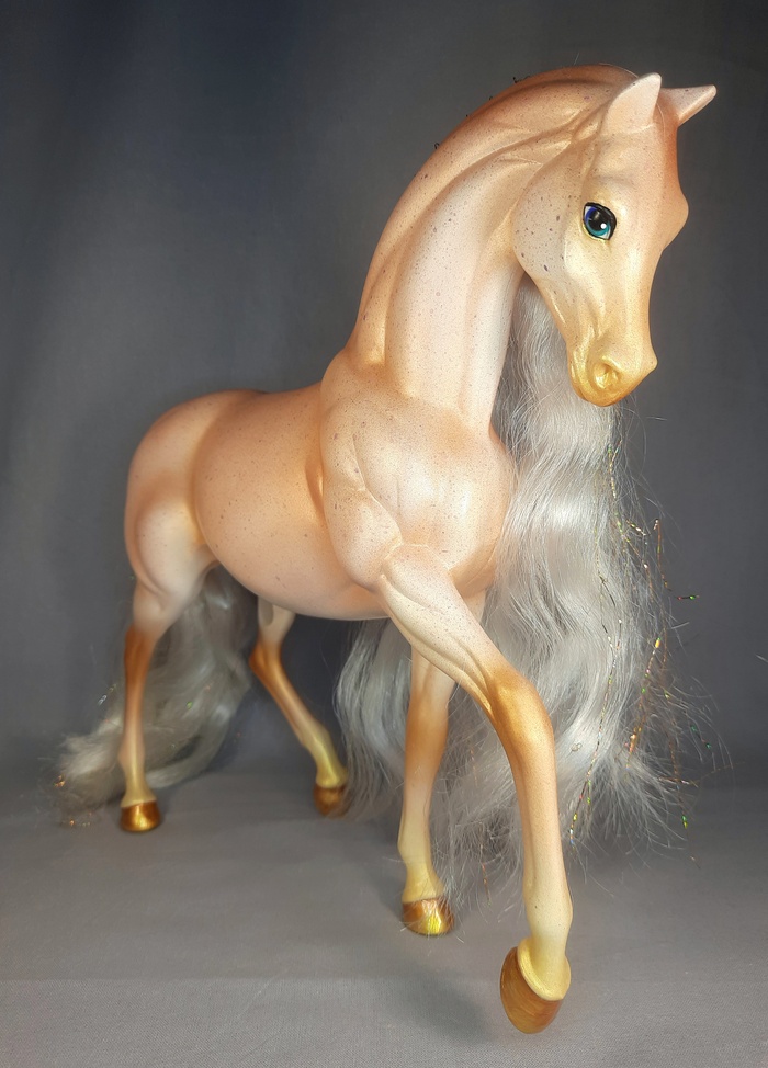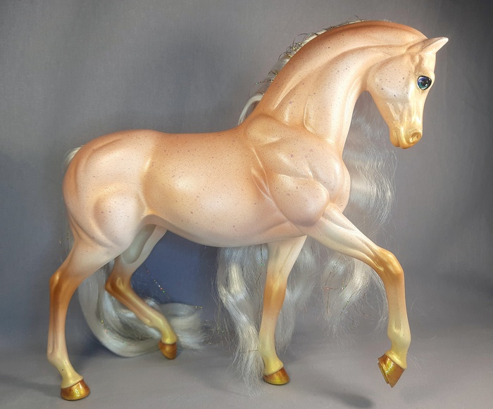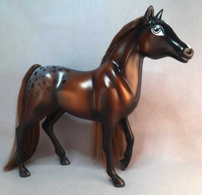 Изменено положение уголков губ с "улыбки" в "спокойное", заполнены пустоты на внутренних поверхностях задних копыт. Полностью перекрашен, а грива и хвост из окрашенной натуральной козьей шерсти в смеси с родными трессами.