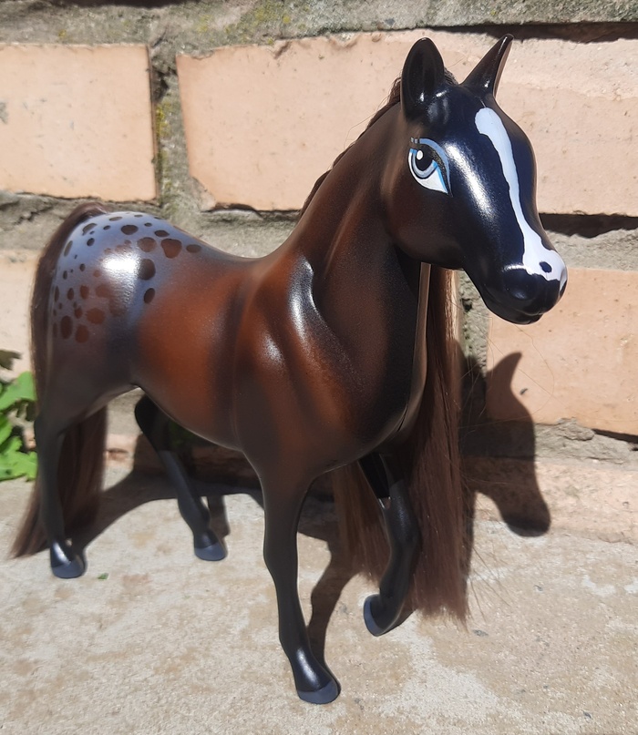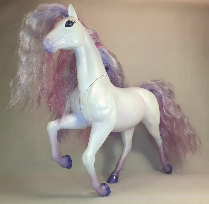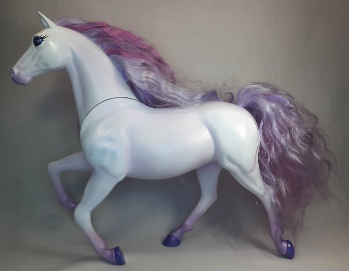 Эта очаровашка не от оригинального производителя (Mattel). Она сменила масть, гриву с хвостом и обрела осмысленный взор. При нажатии на кнопку отлично ходит, но ранее одно из копыт плохо функционировало, поэтому произведена его замена. Могла при ходьбе издавать звуки, а теперь принудительно молчит. Последние фото - до работы.