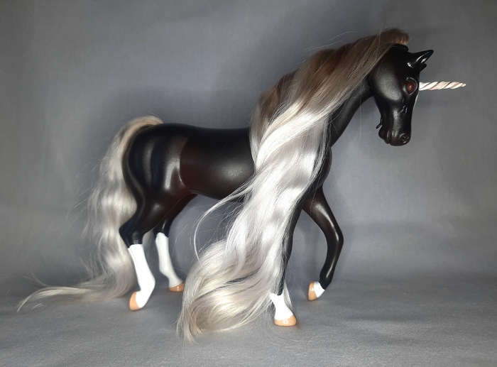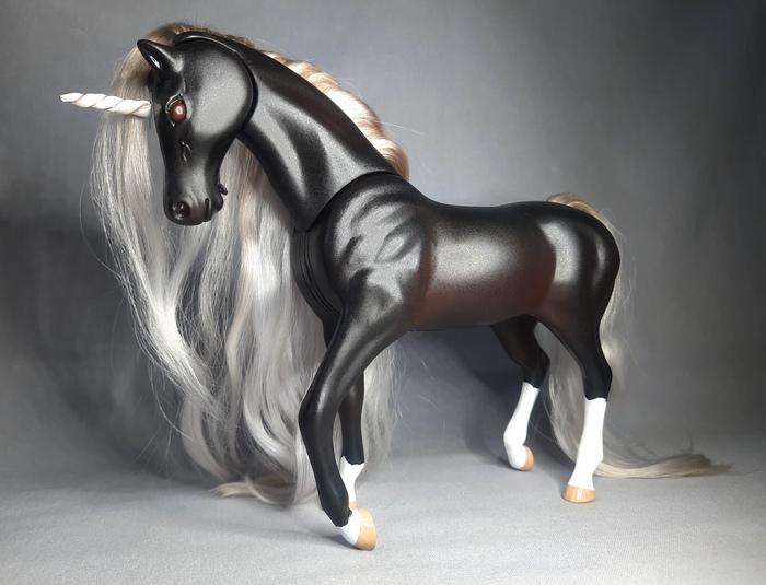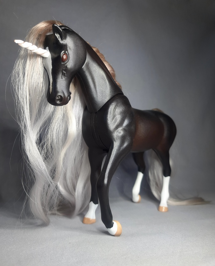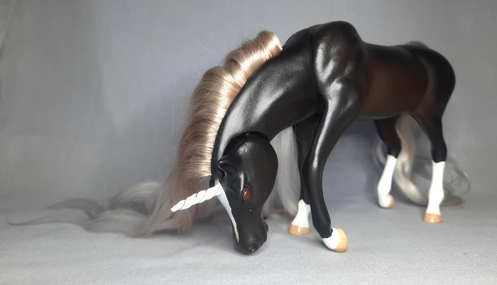 Добавлен рог, убран чубчик и недоуздок, вылеплена ровная шея, перекрашен, грива с хвостом прошиты натуральной козьей шерстью. Последнее фото - до преображения.