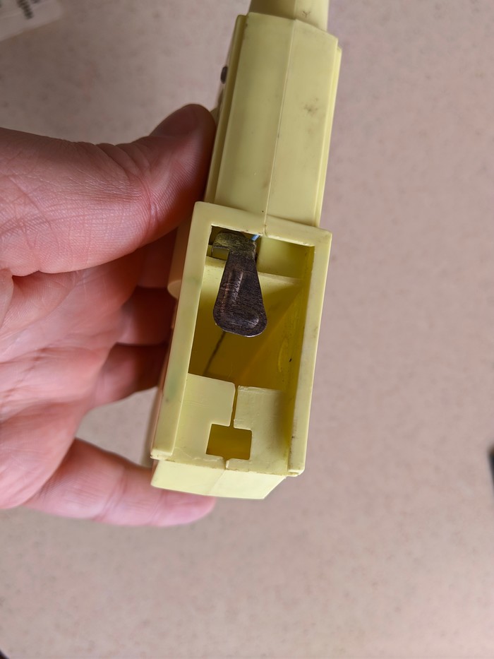 Крышка батарейного отсека с поднимающейся защёлкой, которая висит на тонюсеньком слое пластика. Защёлка ломалась первой, крышка терялась второй, после чего пистолет из режима стрельбы переходил в режим "пиу-пиу-пиу" голосом.