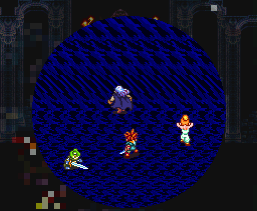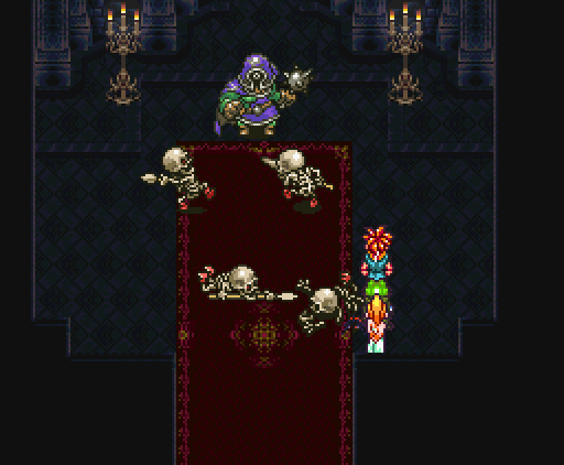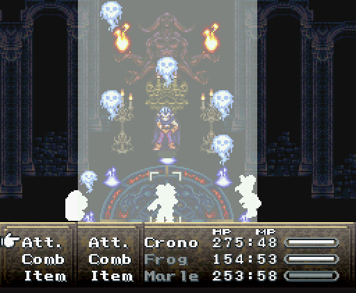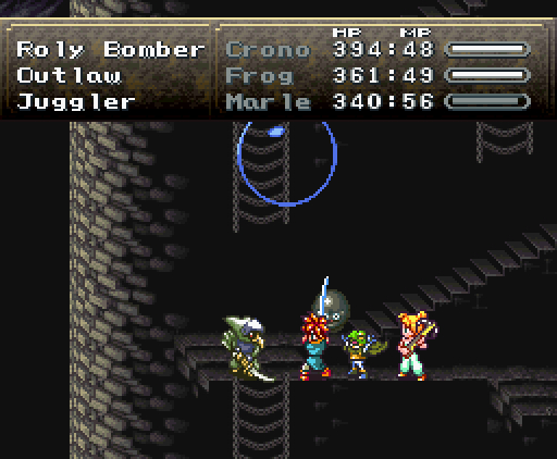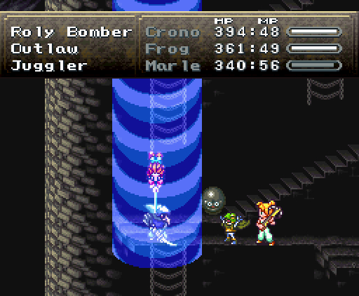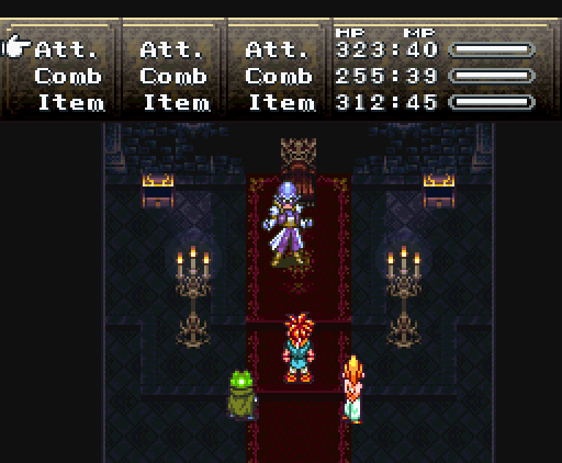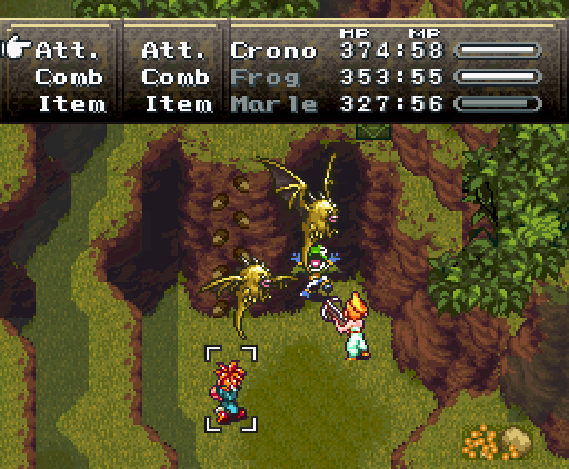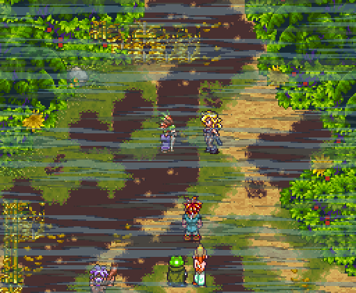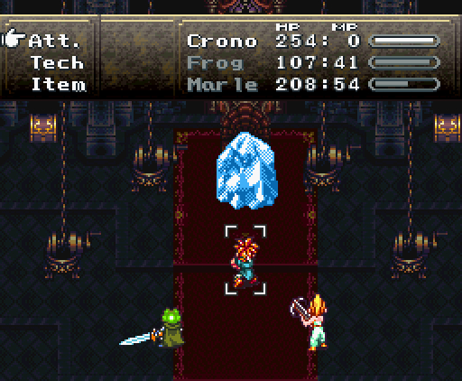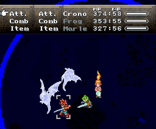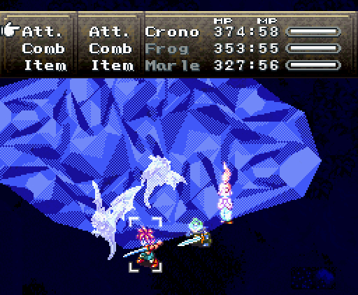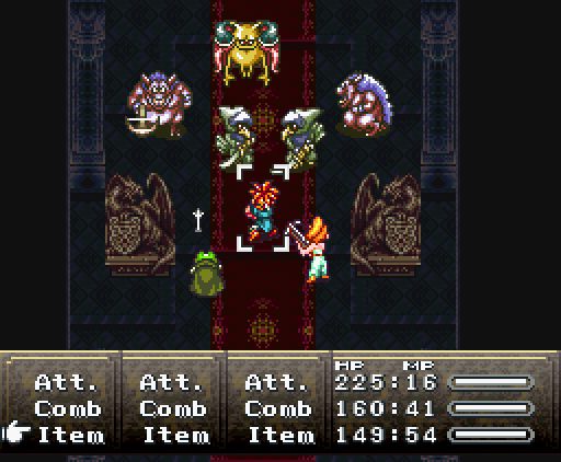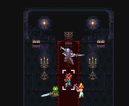 Но что самое интересное, на этом друзья не останавливаются: они изобретают тройную технику под названием *Дуговой импульс*. Хроно прыгает на неприятеля, совершая *яростный удар*, Марл зачаровывает его меч своим *Icega*, и Лягуш тоже совершает *удар в прыжке* - так, что их с Хроно траектории пересекаются крестообразно, как в *Ударе X*.