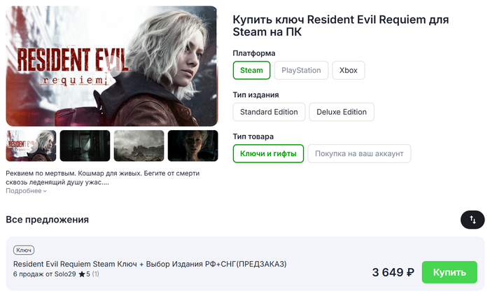 Новая часть «Резидентов» выходит 27 февраля 2026 года. Оформить предзаказ можно уже сейчас. Однако, в связи с санкциями, приобрести игру немного проблематично. В этой статье мы расскажем, как купить Resident Evil Requiem в 2026 году для пользователей PC, Xbox и PlayStation, а также о ее системных требованиях и доступных изданиях.