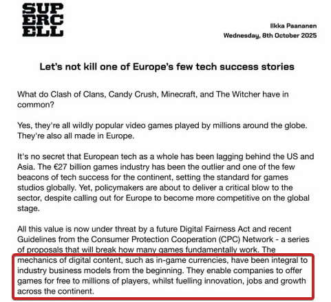 Новые регуляции по части «защиты детей» реально жёсткие. Илкка Паананен целое письмо написал, как эти регуляции повредят компаниям типа Supercell выкачивать деньги из детей.