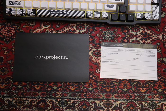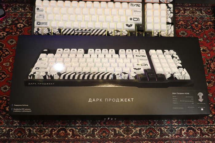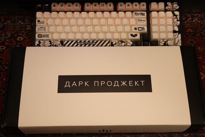 Коробка встречает нас «дорого-богато», картон плотный, приятный на ощупь, на вкладыше мы увидим внешний вид клавиатуры, и немного её характеристик, сняв его нас встретит надпись Дарк Проджект. Что особого сказать о коробке я не знаю, всё равно, как только вы достанете всё необходимое из нее, она отправится пылится на полку, но при желании можете и любоваться ей. Упаковано всё качественно, содержимое точно доедет без повреждений. Так-как отзыв пишу, уже используя клавиатуру, фото будут немного странные (да и фото так себе, приношу свои извинения). Анбоксинг можете глянуть на ютубе).