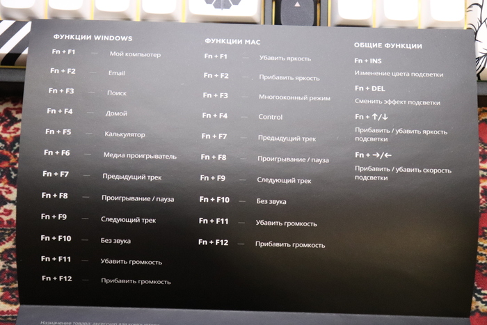 В остальном про комплектацию особо сказать не чего, она базовая. Затронем тогда сразу переключатели и кейкапы для приличия, хотя я считаю, что опять же девяносто процентам людей, эта вся информация и не нужона, как интернет бабке из мема. Ребята придумали сделать переключатель прозрачными дабы у четланей бУкавы святились в темноте, а в остальном всё тоже самое и ничего там экзотического нет, да и не факт, что про прозрачный корпус им не кто не подсказал. Кейкапы или квадратики с бУкавами, тут тоже особе нечего рассказать, пластик PBT двойного отлива что даст вам долговечное покрытие, бУкавы стераться не будут, хотя и на обычных квадратах у меня ничего не стиралось, но если что сможете их заменить они отдельно тоже продаются. Но буду справедлив сами кейкапы и клавиатуры с нормальной русской раскладкой не так просто найти и ребята молодцы, что продают их отдельно, почему-то наши братья китайцы не горят желанием производить их нормально, видимо рынок маловат.