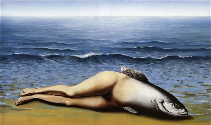 Во-первых, разработчики преподносят игроку образы, в которых по законам сюрреализма сочетается несочетаемое. Самый явный в данном случае пример – это неоднократно встречаемые люди с головами животных, птиц или же насекомых. Данный визуальный прием мы можем встретить в работах известного живописца-сюрреалиста Рене Магритта в произведении «Коллективное изобретение», на котором изображено фантастическое существо – полуженщина-полурыба.
